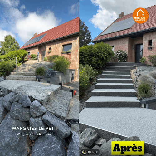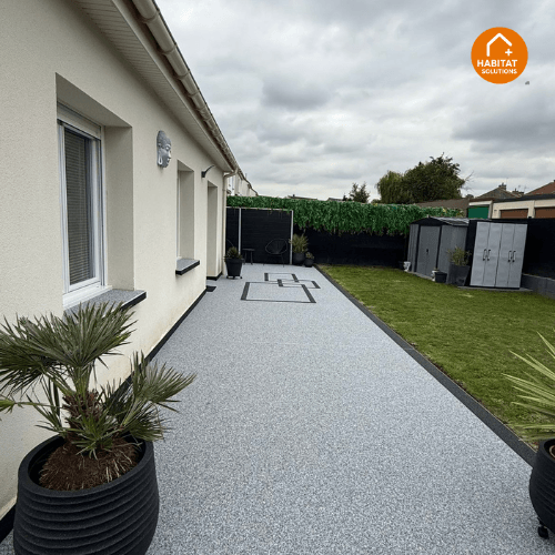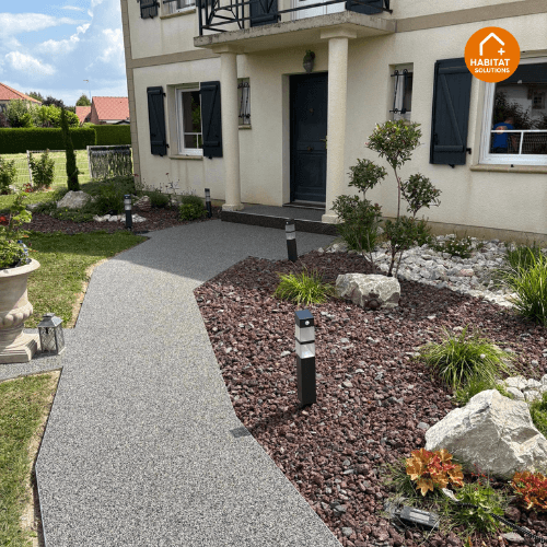 Habitat Plus Solutions crée des allées, terrasses et entrées de maison en marbre résiné pour une finition haut de gamme, durable et facile d’entretien.
